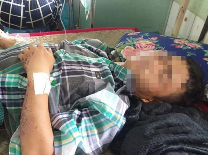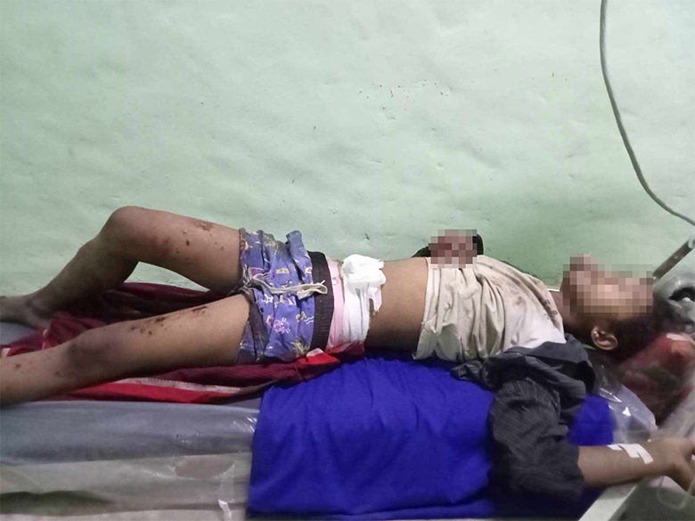KHRG received these photos in April 2023. They show two villagers injured by a landmine explosion. On April 6th 2023, at about 3:30 pm, Naw[6] A--- (30 years old) and her daughter, Naw B--- (12 years old) from C--- village, Win Raw village tract[7], Tha Htoo (Thaton) Township, stepped on a landmine in a forest when they went to forage vegetables. The explosion injured them both: Naw A--- was injured on her hip and back, and Naw B--- was injured on her abdomen and legs. They sought treatment in a clinic in D--- village, run by the Karen National Union (KNU)[8]. It is unknown whether this landmine was planted by the SAC or the Karen National Liberation Army (KNLA)[9]. The incident happened in a place where both SAC and KNLA operated, and fighting between these armed groups often occurred in this area. [Photos: KHRG]