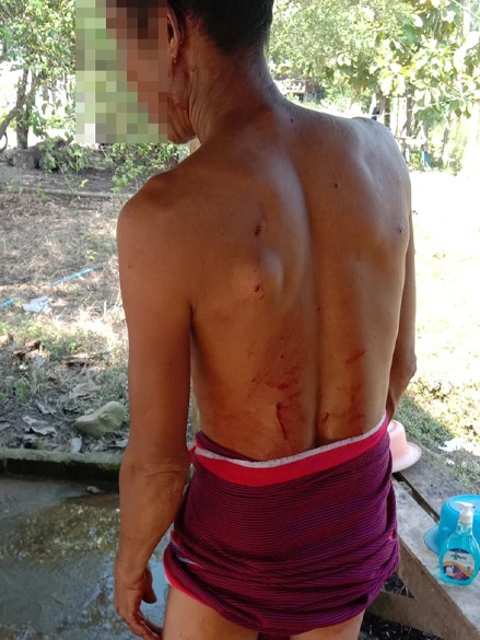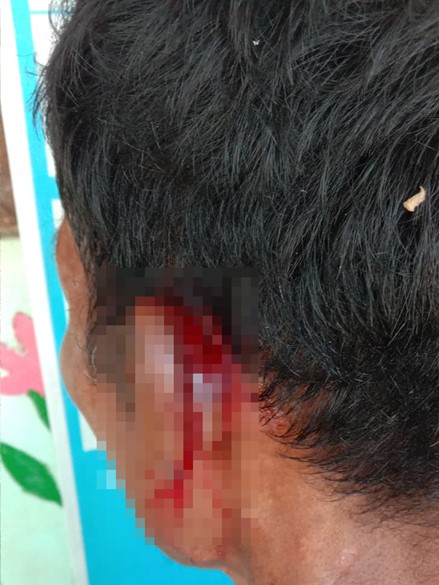The three photos were taken on October 20th 2022 and show the injuries sustained by Ak--- from a tripwire landmine explosion in Al--- village, Maung Khee village tract, Kaw T’Ree (Kawkareik) Township, earlier that day. The first two photos show the injuries to his left ear and left leg, and the last photo below shows the injuries he sustained on his back. The tripwire landmine was assumed by villagers to have been set up by SAC military based at the Aung May K’Lar military camp. This incident occurred when Ak--- went to make charcoal beside the military camp, as he was returning to his kiln with wood he had collected in the forest close to the camp. He was sent to Waw Lay Hospital in Waw Lay Town, Kaw T’Ree Township, where he stayed for four days of treatment.[24] [Photos: Local villager]