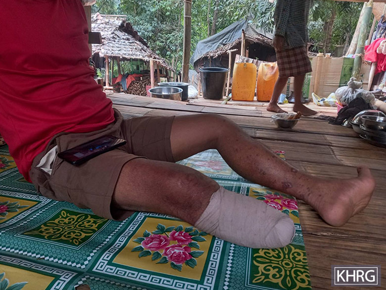 This photo was taken on May 29th 2022 of Saw Ab---, a 58-year-old villager from Ac--- village, Ler Muh Plaw village tract, Lu Thaw Township. On May 28th 2022 at 6 am, Saw Ab--- stepped on a landmine whilst travelling to his hill farmlands. The landmine had been planted by SAC soldiers from LIB #37. Saw Ab--- had lost his left leg back in 2011 from a landmine explosion, making this the second time he was injured by a landmine. In the most recent incident, he was injured on the same leg that had been amputated and sustained slight injuries on his other leg and his arms. The explosion damaged his prosthetic leg. He is now facing difficulties in earning a livelihood because of his injuries. He expressed his need of support from organisations that specifically provide aid to landmine victims. This photo shows Saw Ab--- recovering at a clinic from the injuries he sustained from the landmine explosion.[23] [Photo: KHRG]