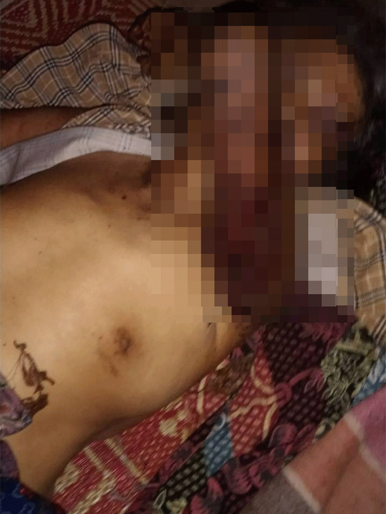 These photos were taken on January 13th 2023 in G--- village, Than Moe Taung village tract, Daw Hpa Hkoh (Thandaunggyi) Township. They show the body of Daw[15] Hkin Win, a 68-year-old villager, who was killed by a landmine on January 13th 2023. The explosion happened on Than Moe Taung road in G--- village when she was returning home from collecting wood nearby, and stepped on the landmine. Her left leg was completely blown off below the knee and she sustained severe injuries to her right leg, her left arm and her face. The landmine was planted by SAC troops following armed clashes in the area.[16] [Photos: Local villager]