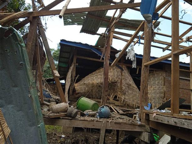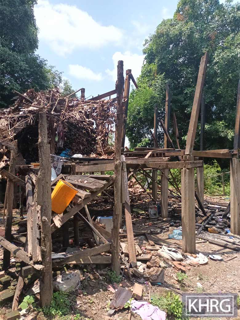 This photo was taken in May 2023 in Cf--- village, Ywa Ka Lay village tract, Kru Tu Township, Dooplaya District. It shows a villager’s house destroyed by SAC LIB #546 indiscriminate shelling on May 28th 2023. The mortar shells explosion also injured one child. SAC LIB #546 is led by Battalion Commander Aok Kant Min. [Photo: KHRG]