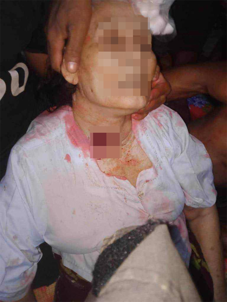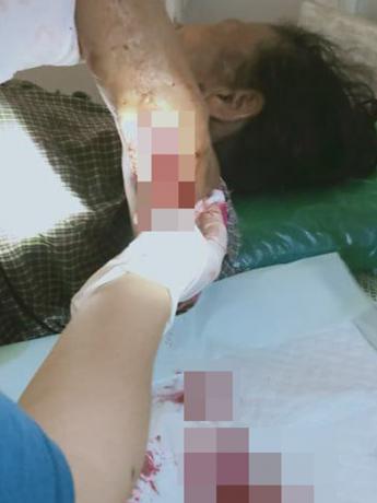 This photo was taken on August 26th 2023 in U--- village, Special Area, Htaw Ta Htoo Township, Taw Oo District. This photo shows a 48-year-old villager named Ma[9] V--- who was injured by shrapnel from SAC indiscriminate shelling of mortar rounds that landed in U--- village, where Ma V--- lives, and surrounding communities.[10] [Photo: Local villager]