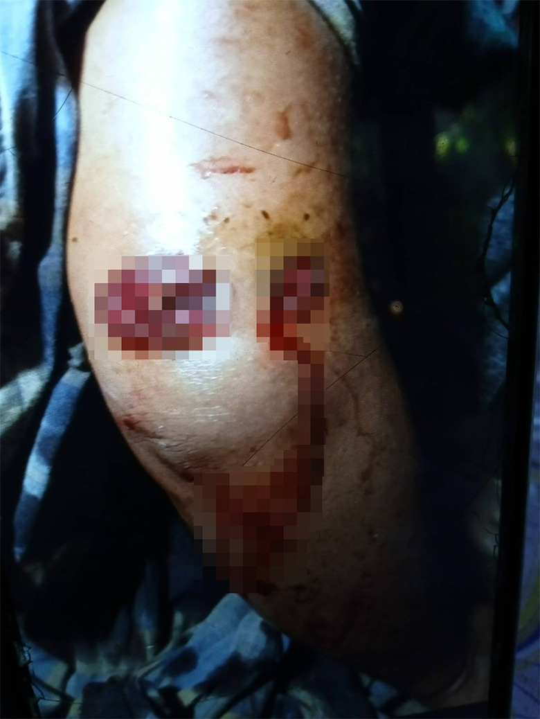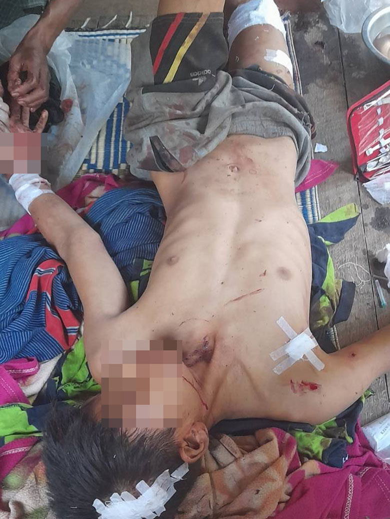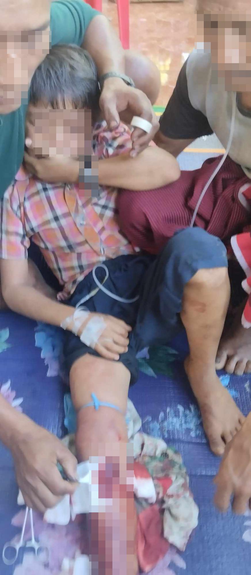This photo was taken in March 2023 in Ar--- village, Aww Poo area, Ler Muh Lah Township, Mergui-Tavoy District. On that day, SAC IB #285, based in P’Law Kon Aww Poo army camp, shelled four 120mm mortar rounds into Ar--- village, injurying four villagers. The injured were Saw As--- (38 years old), injured on his waist and his arm; Saw At--- (30 years old), minorly injured on his chest; Saw Au--- (25 years old), injured on his waist; and Saw Av---, injured on his neck (7 years old). The villagers were playing football when they were hit. Saw As--- was sent to a clinic in Aw--- village, P’Law area, and later transferred to a hospital in P’Law Town. [Photo: Local villager]
