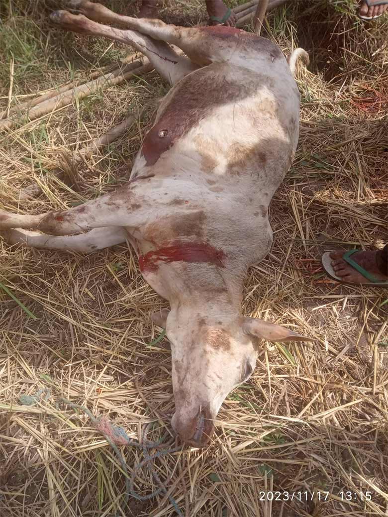 This photo was taken on November 17th 2023 in W--- village, Day Lo Mu Nu area, Htaw Ta Htoo Township, Taw Oo District. On that day, SAC troops, including soldiers from IB #39, indiscriminately fired mortar rounds into Day Loh Mu Nu area and one of the shells landed on a farm near W--- village. It exploded and shrapnel killed a cow owned by a villager named Saw X---[12]. [Photo: Local villager]