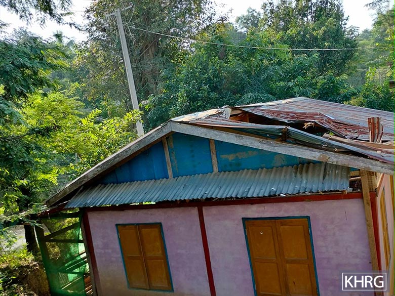 This photo was taken on December 7th 2023 in J--- village, Eee Heh village tract, Hpa-an Township, Doo Tha Htoo District. This photo shows the damage caused by the SAC shelling of mortar rounds, that landed on the roof of a house, on December 5th 2023. The roof was destroyed by the explosion. [Photo: KHRG]