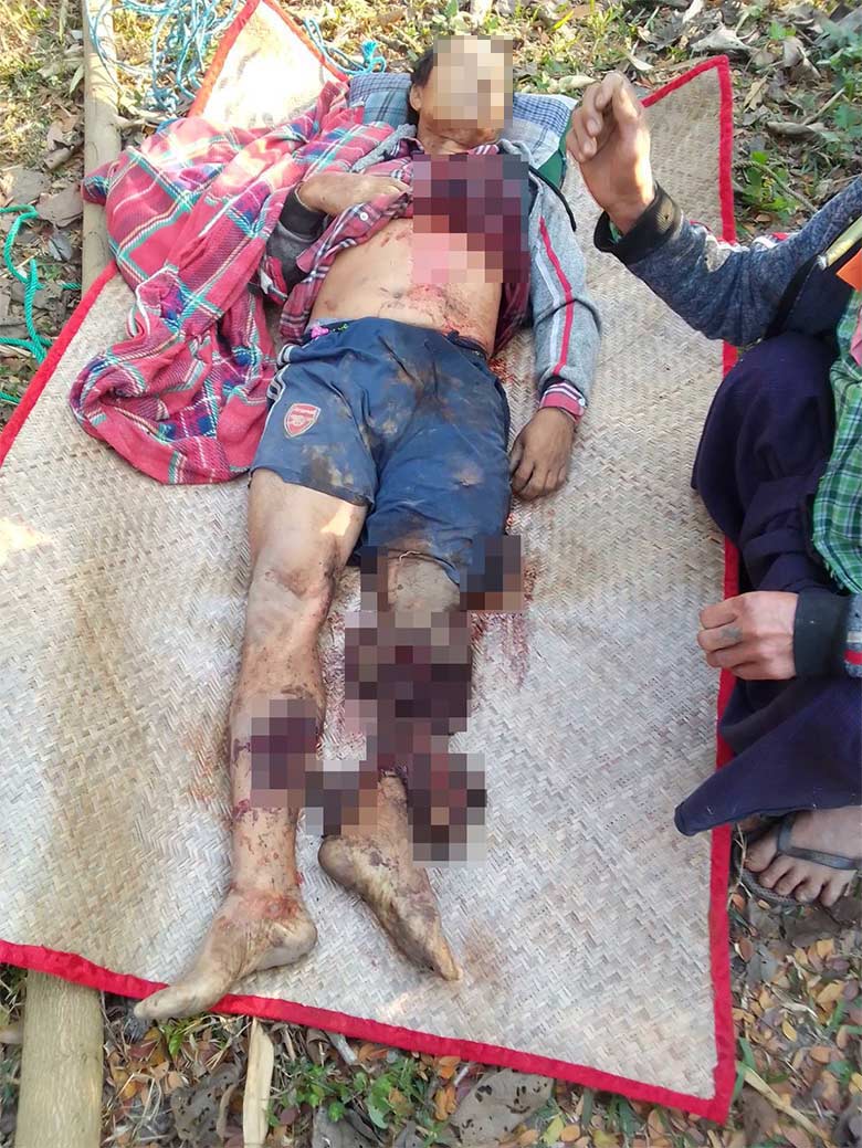 This photo was taken on January 20th 2024, in Bs--- village, Kya Inn Chaung village tract, Ta Naw Th’Ree Township, Mergui-Tavoy District. This photo shows a villager who was killed by the detonation of a mortar round previously shelled by the SAC, which had remained unexploded. The shell detonated while he was cleaning vegetation on his plantation: the villager accidentally hit the UXO that was under a bush. [Photo: Local villager]