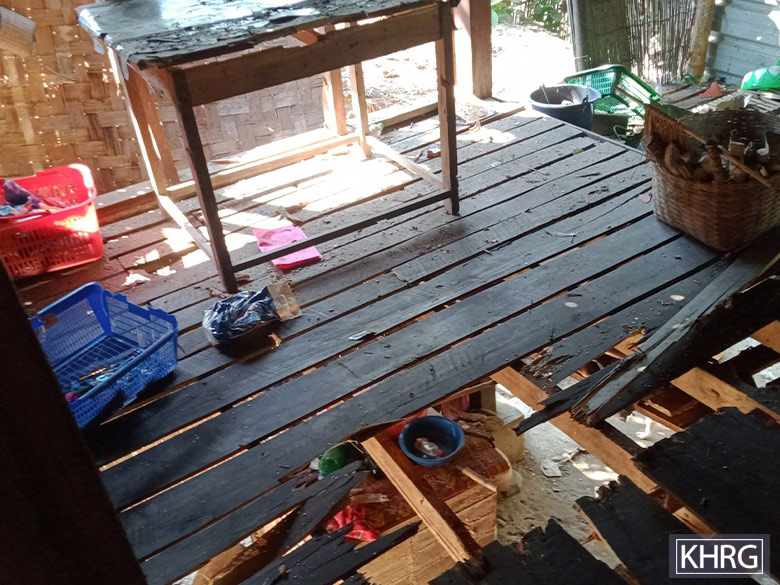 This photo was taken in June 2023 in Ct--- village, Ta Kon Taing village tract, Way Raw Township, Dooplaya District. It shows a villager’s house damaged by mortar shells, fired by SAC Artillery Unit #318 on June 17th 2023. Many houses were destroyed during this incident. The same SAC troops shelled mortar rounds again on June 19th that injured two villagers. [Photo: KHRG]