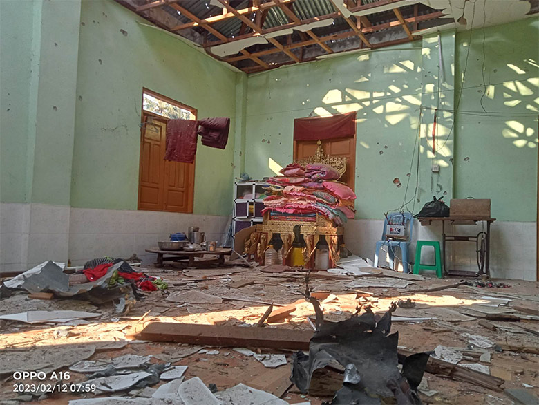 These photos were taken on February 12th 2023, in B--- village, Shwe Yaung Pya village tract, Tha Htoo Township, Doo Tha Htoo District. These photos show the damages caused by SAC Light Infantry Battalion (LIB)[3] #9, who indiscriminately shelled mortar rounds in the area. Three shells landed in the monastery compound, in B--- village, on February 11th, at 8:37 pm. Due to the explosions, three monks were injured and the monastery buildings and materials were destroyed. SAC LIB #9 is based in Win Pa army camp, under the command of Light Infantry Division (LID)[4] #44. [Photos: Local villager]