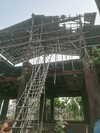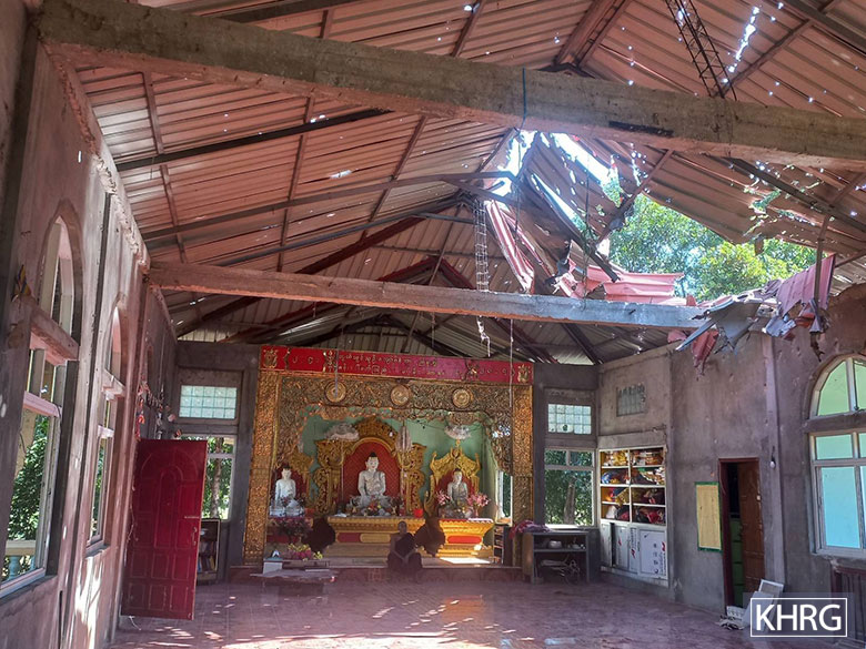 This photo was taken on December 24th 2023 in Aq--- village, Hsaw Htee Township, Kler Lwee Htoo District. It shows the roof of the monastery building destroyed by the explosion of 120mm mortar rounds shelled by SAC LIB #20, based in Nyaunglebin Town army camp, on December 12th 2023, at 10:40 am. The SAC troops indiscriminately shelled three mortar rounds toward Aq--- village; two of them landed near Aq--- village and the other one landed on Aq--- monastery building, destroying the monastery roof and the Buddha statue. [Photo: KHRG]