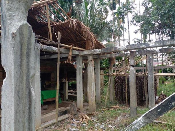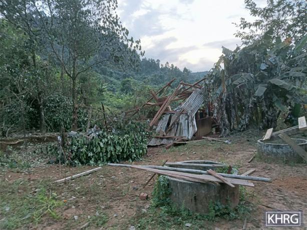 The photo on the left was taken on May 27th 2023 in Mway Twin village tract, Moo Township, Kler Lwee Htoo District. On March 18th 2023, SAC LIB #599, based in Ton Taw army camp, and other SAC troops shelled mortar rounds into Xx--- and Yy--- villages. The explosions destroyed two villagers’ houses and one monastery building. Villagers fled from their village. [Photo: KHRG]