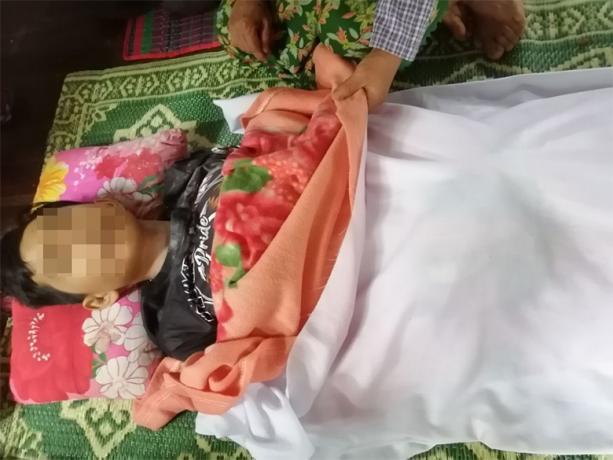 These photos were taken on August 29th 2023 in Ak--- village, Pyin Yay village tract, Hsaw Htee Township, Kler Lwee Htoo District. On that day, SAC LIB #264 indiscriminately shelled 120mm mortar rounds and three of them landed in Ak--- village. The explosion injured four villagers, killed one girl, and destroyed five houses. The photos above show one of the damaged houses (left) and the victim’s body prepared for ceremonial burial (right). [Photos: Local villager]