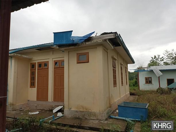 The photo on the left was taken on June 13th 2023, in Zz--- village, Daw Mo village tract, Ler Doh Township, Kler Lwee Htoo District. On June 9th 2023, SAC shelled mortar into Zz--- village and one of the mortar rounds landed on the clinic, as shown in the photo. The explosion destroyed the clinic roof and some medical supplies inside. [Photo: KHRG]