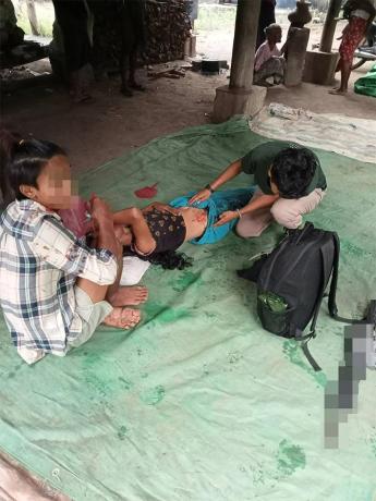 This photo was taken on October 18th 2023 in Am--- village, Pyu special area, Moo Township, Kler Lwee Htoo District. This photo shows one of the four injured villagers from An--- village, Pyu special area, accessing medical treatment. He was injured by mortar shelling conducted by SAC LIB #307, in Am--- village, on October 17th 2023. LIB #307 is based in Shwe Wa army camp. [Photo: KHRG]