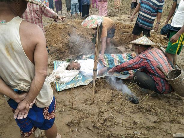 This photo was taken on August 16th 2023 in Bv--- village, Meh Klaw village tract, Bu Tho Township, Mu Traw District. It shows a Bv--- villager, U Bw--- (53 years old), who died from SAC indiscriminate shelling conducted during fighting with local KNLA on August 15th 2023. U Bw--- was killed by shrapnel while he was working on his farm. In the evening of the incident date, U Bw--- did not return home so his family went looking for him and found his corpse the next day. Villagers had to bury him in a rush, on that same day. [Photo: Local villager]