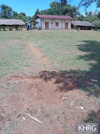 This photo was taken on October 24th 2023 in Bx--- village, Ma Htaw village tract, Dwe Lo Township, Mu Traw District. On October 18th 2023, SAC soldiers from Ma Htaw army camp entered KNU-controlled area, on their way to collect more rations and ammunition, and indiscriminately fired mortar shells when they were attacked by local KNLA troops. One of the mortar rounds landed in Bx--- school campus so students did not feel secure to go to school anymore. The SAC battalions regularly based in Ma Htaw army camp are LIBs #401, #402, #404, #407 and #3010. Throughout 2023, these SAC troops conducted regular indiscriminate shelling into four village tracts around their army base. [Photo: KHRG]
