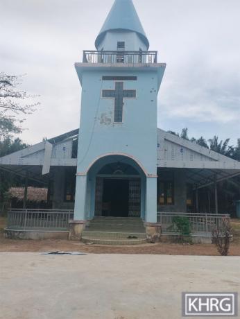 These photos were taken on December 3rd 2023 in Bm--- village, Sa Tin area, Ler K’Hsaw Township, Mergui-Tavoy District. The top-left photo shows a church damaged by SAC IB #358 and LIB #224 indiscriminate shooting after fighting happened with local PDF on December 1st. Two houses were also damaged. The photo on the right shows bullet shells retrieved. [Photos: KHRG]