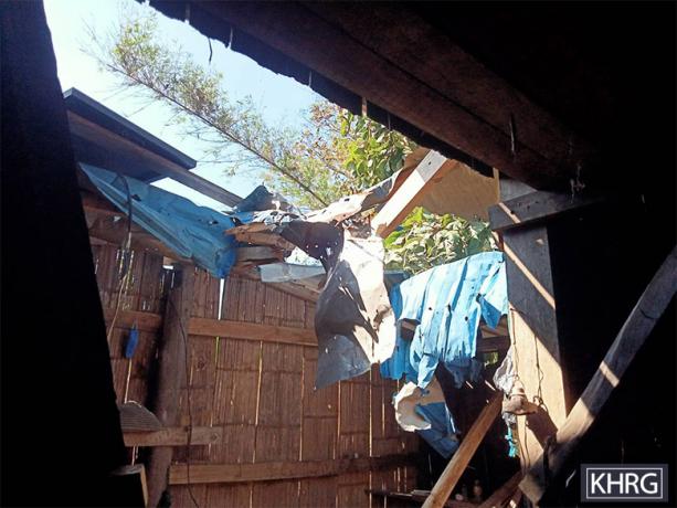This photo was taken on November 28th 2023 in Aa--- village, Day Lo Mu Nu area, Htaw Ta Htoo Township, Taw Oo District. It shows the roof of a house damaged by SAC IB #39 shelling of mortar rounds in Aa--- village, on November 19th. The mortar explosion damaged three other houses in the same village[13]. [Photo: KHRG]