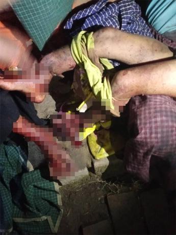This photo was taken on March 20th 2023 in C--- village, Ah Lu village tract, Kyeh Htoh Township, Doo Tha Htoo District. It shows a villager named U[5] D--- who was killed by shrapnel from SAC shelling. On that day, SAC Artillery Unit #602, under Light Infantry Division (LID) #44, shelled 120mm mortar rounds in C--- village and one landed beside U D---’s house. U D---’s wife also sustained a minor injury from shrapnel. [Photo: KHRG]