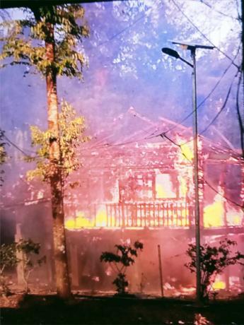 These photos were taken on December 21st 2023 in Bq--- village, Aw Poo area, Ler Mu Lah Township, Mergui-Tavoy District. On that day, SAC IB #285 shelled about 80 rounds of mortar into Bq--- village, destroying a villager’s paddy storage, two houses, and all properties inside the houses, which caught on fire. Shrapnel injured one villager on the head, who was sent to Br--- clinic, in P’Law area, Ler Mu Lah Township. The injured villager was then transferred to a hospital in Thailand. [Photo: Local village]