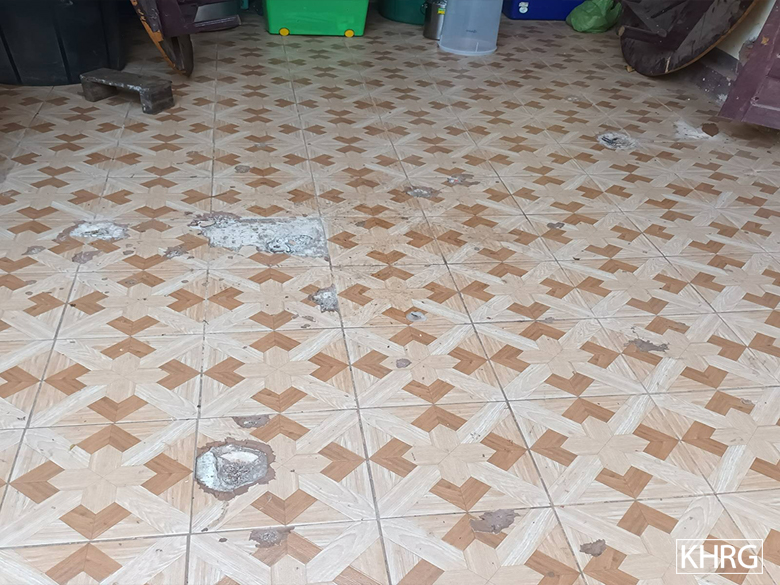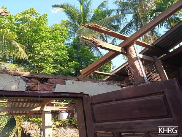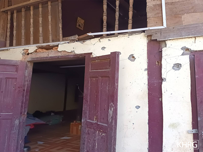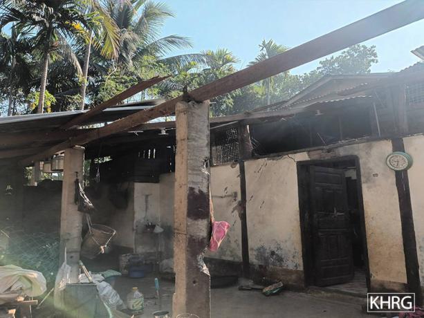 These photos were taken on January 11th 2024, in A--- village, Raw Keh village tract, Kruh Tuh Township, Dooplaya District. These photos show Daw G---’s house, which was damaged by SAC mortar shelling. The shelling killed Saw D--- (11 years old) and injured Nan E--- (13 years old) and Saw F--- (19 years old). [Photos: KHRG]