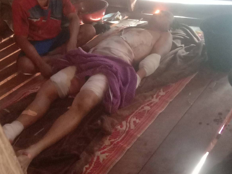 These pictures were taken in March 2024 by local villagers. On March 20th 2024, at 5 pm, an air strike injured four villagers from G--- village, Noh Poe village tract, Kaw T’Ree Township, Dooplaya District. The photos above show one of the injured victims that died while being transported to B--- clinic, P’Lu village tract, for medical treatment. [Photos: Local villager]