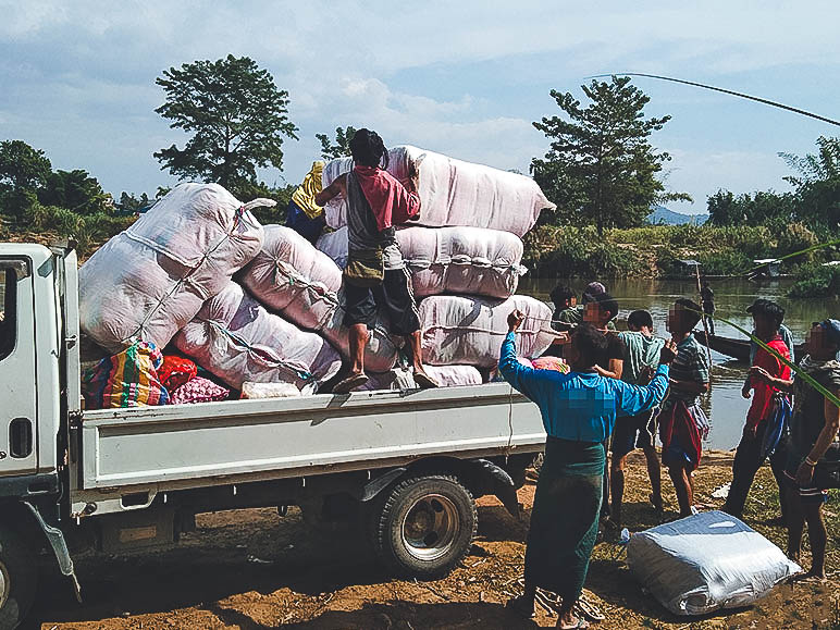 This photo was taken in December 2021 in an temporary displacement site near Bw--- village, Palu village tract, Kaw T’Ree Township, Dooplaya District. It shows displaced villagers from Lay Kay Kaw area collecting humanitarian aid, including food and clothes, delivered by Karen HRDs working for a local civil society organisation. Fighting and shelling happened in Lay Kaw Kaw area in December 2021 causing thousands of people to flee. [Photo: Local HRD]