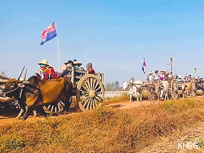 This photo was taken on March 2nd 2021. Over 1,000 villagers from 11 villages in Thoo Ka Bee, Wel Lar Daw, Noh Ghaw, and Par Ta Lar village tracts in Ler Doh (Kyaukkyi) Township, Kler Lwee Htoo District came together in protest. People carried out the protest by cart, as seen in this photo, as well as on motorbikes. [Photo: KHRG]