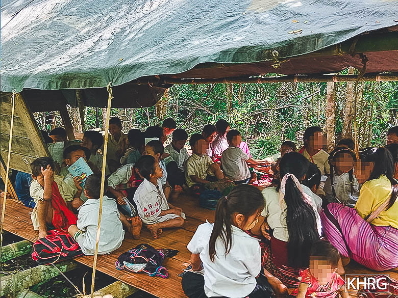 This photo was taken in September 2023 in a forest in Saw Mu Plaw village tract, Lu Thaw Township, Mu Traw District. Students and teachers from Bu--- primary school in Saw Muh Plaw village tract, did not feel safe attending the village school due to an SAC air strike and fled to a forest. The photo shows a teacher (on the right, wearing a yellow t-shirt) providing education to displaced children in a makeshift shelter. [Photo: KHRG]