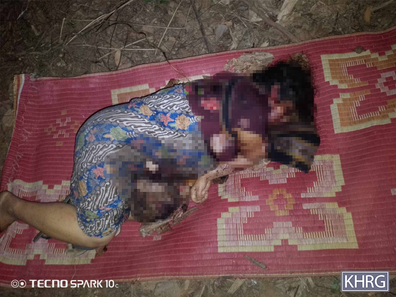 These photos were taken on May 19th and 21st 2024, respectively. The left photo shows Naw G---’s body, who was shot dead by SAC LIB #557, #339 and #311 soldiers at Ler Klaw village, Hter Wa Law village tract, Kaw T’Ree Township, on May 19nd 2024. The right photo shows her wooden grave marker in F--- village, Hter Wa Law village tract. [Photos: local villager]