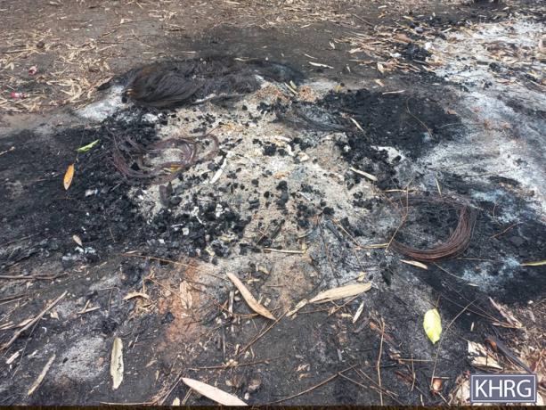 This photo was taken in May 2024 in a road between K--- village and C--- village hill farming area, Hter Wa Law village tract, Kaw T’Ree Townsip. This photo shows the remains of the fire where Hpa Hkler Poe’s remains were burned by local F--- villagers, in Baw N’Hta, near a displacement site area, in Hter Wa Law village tract, on May 21st 2024. [Photo: KHRG]
