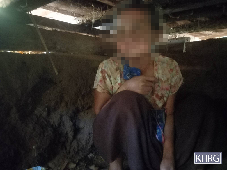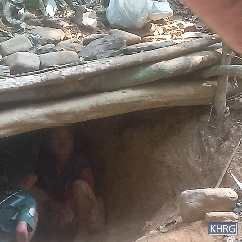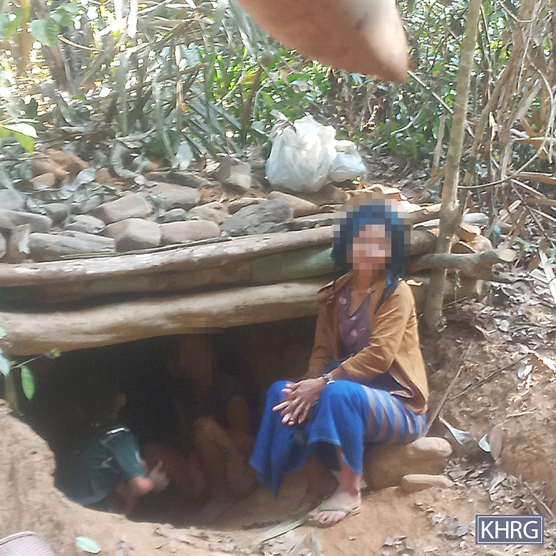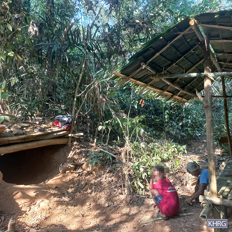 These photos were taken in March 2024, at Bq--- place near Br--- village, Meh Nyuh village tract, Bu Tho Township. These photos show displaced villagers from Bp--- village, Meh Nyuh village tract, who were hiding from SAC air strikes in a bunker. On March 15th 2024, KNLA combined with PDF troops attacked an SAC military camp in Pah Pu Town, Bu Tho Township. Following the attacks, SAC aircraft patrolled over area and conducted air strikes in an area 20 miles (32 kilometres) far from the town, so villagers were afraid and fled to the jungle. [Photos: KHRG]