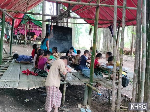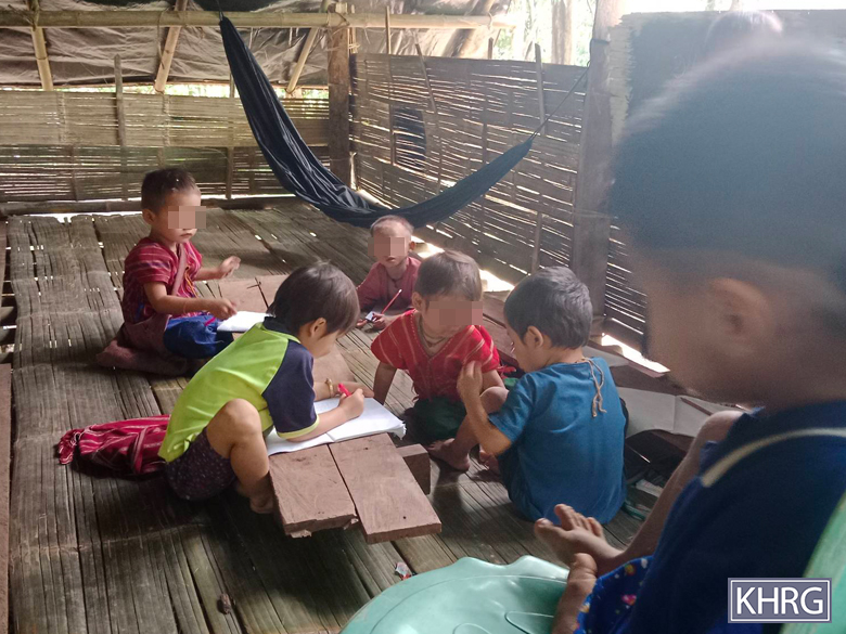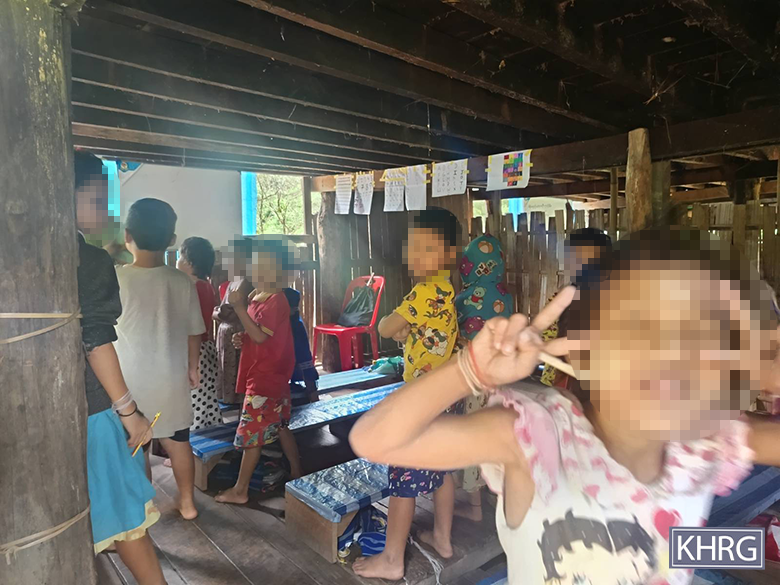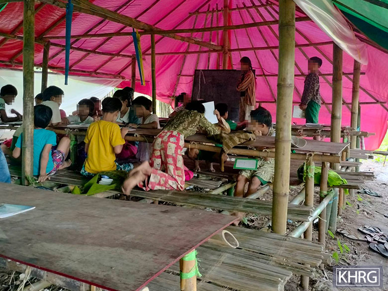 These photos were taken in July 2024, in Bs--- displacement site, Hkaw Pu village tract, Bu Tho Township, Mu Traw District. In 2024, the conflict between KNLA combined with PDF and SAC increased in Hkaw Pu village tract, so Bt--- villagers had to flee from their village to Bs--- displacement site. These photos show students learning in a school that was built by displaced villagers in the displacement site. [Photos: KHRG]