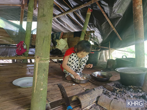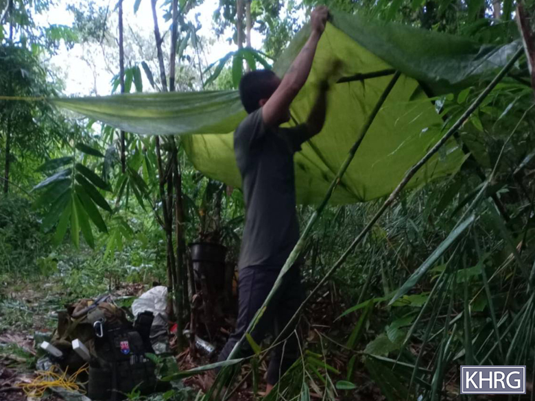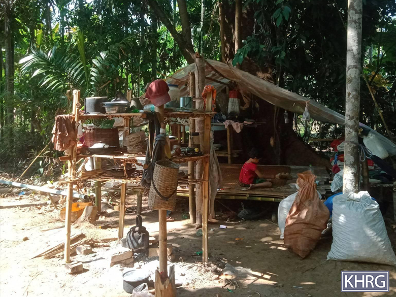 These photos were taken in March 2024, at Bo--- jungle, near Bp--- village, Meh Nyuh village tract, Bu Tho Township, Mu Traw District. These photos show villagers from Bp--- village who fled to the jungle and had to live in the temporary huts that they built due to SAC shelling. [Photos: KHRG]