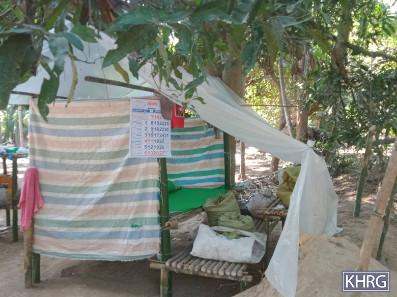 These photos were taken in January 2024, at a betel nut[13] plantation field, in Ak--- village, Paw Pee Der village tract, Moo Township, Kler Lwee Htoo District. These photos display shelters built by villagers from Ak--- village and Al--- villages who were displaced in a betel nut plantation field. Villagers had been displaced since Karen National Liberation Army (KNLA)[14] soldiers, combined with PDF soldiers, attacked SAC Light Infantry Battalion (LIB)[15] #590 in nearby Am--- village, Moo Special area, on December 2nd 2023. Villagers remained afraid of fighting and potential attacks on their villages. [Photos: KHRG]