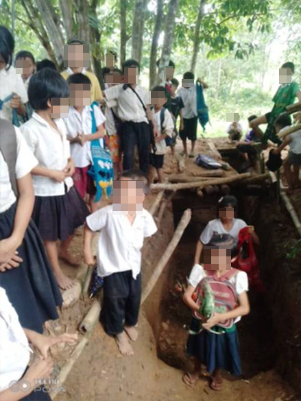 The State Administration Council (SAC)[1]’s constant shelling, air strikes, and firing into and near villages in locally-defined Karen State[2] have resulted in death and injuries for villagers, damaged and destroyed villagers’ properties, and inflicted fear on villagers to live in their homes, forcing them to flee. While displaced, villagers encountered difficulties and challenges to secure their livelihood, and obtain healthcare and education. After leaving their homes, villagers live in caves, small huts, tarpaulin tents, makeshift bunkers, in plantation areas and farmlands, in the jungle, and near river sources. Their struggles increase during the rainy season (July to October). Common sicknesses in displacement areas include fever, colds, and diarrhoea; which mostly remain untreated due to a lack of sufficient medicine or healthcare professionals in remote areas where villagers hide. Villagers also encounter food scarcity during displacement as they are unable to return to their villages due to imposed travel restrictions, ongoing fighting, and risk of attacks. In displacement areas, children endure hardships and have to take risks to continue their studies in small makeshift shelters, lacking necessary materials, and constantly in fear.