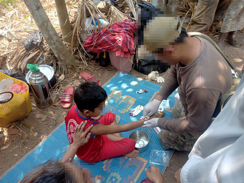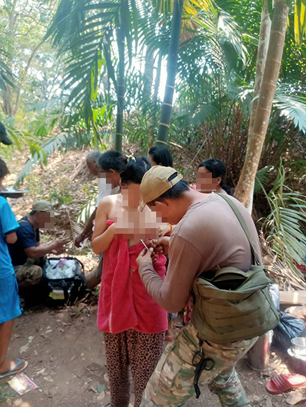 A villager took these photos on March 31st 2024 in the jungle outside Bg--- Town, Lu Thaw Township, Mu Traw District. These photos show displaced villagers receiving treatment from healthcare workers [name of organisation censored for security] after the SAC air strikes conducted in Bg--- Town, on Bh--- temple, that same day. Nine people were injured, including children, because of the SAC air strikes, and seven villagers died. [Photos: Local villager]