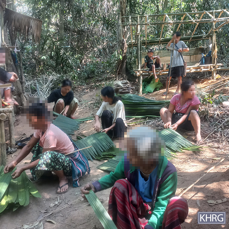 These photos were taken in March 2024, in Bu--- displacement site, near Bp--- village, Meh Nyuh village tract, Bu Tho Township, Mu Traw District. These photos show displaced villagers making a roof out of leaves to build temporary huts during displacement. On March 28th 2024, SAC conducted air strikes in Meh Nyuh village tract so the villagers from Meh Nyuh village tract had to flee to jungle. [Photo: KHRG]
