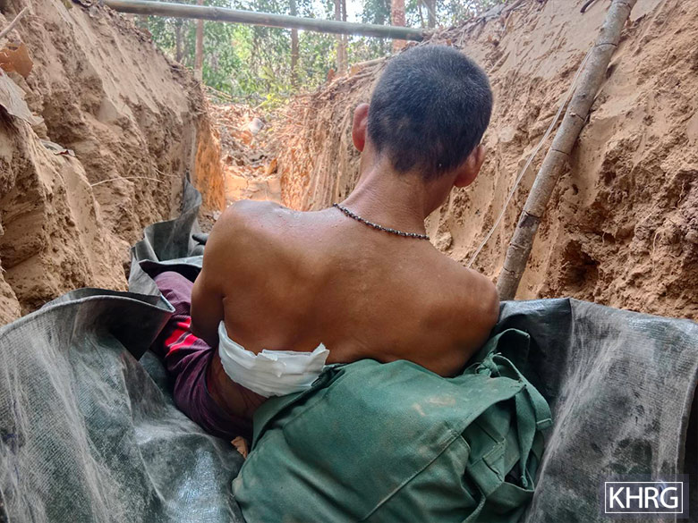 These photos were taken in April 2024 on a trench in a jungle near Bj--- village, Ma Taw village tract, Dwe Lo Township, Mu Traw District. Villagers use this place to hide from SAC shelling and air strikes. On April 3rd 2024, around 7 am, the SAC conducted mortar shelling in Bj--- village, and a villager named Saw D--- (60 years old) was injured by shrapnel on his back, lips and left hand. On that day, he was sent to Bk--- clinic, Pay Kay village tract, Lu Thaw Township, to get treatment. He was looked after in Bl--- temporary healthcare shelter before he was moved to Bk--- clinic. [Photos: KHRG]