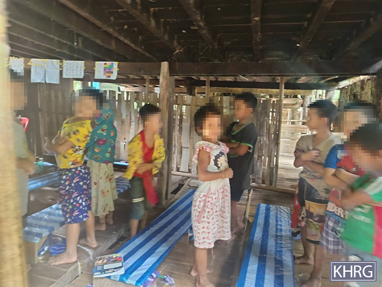 These photos were taken in June 2024, at Saw[9] B---’s plantation which is a half mile [0.8 kilometres] from Ah--- village, Day Loh Mu Nu area, Htaw Ta Htoo Township, Taw Oo District. A skirmish happened between SAC troops and People’s Defence Force (PDF)10] soldiers on September 12th 2023 in Ai--- village, Day Loh Mu Nu area. On September 13th 2023, SAC combined troops, including Infantry Battalion (IB)[11] #39, soldiers were patrolling into Ah--- village, Ai--- village and Aj--- village, in Day Loh Mu Nu area. Therefore, villagers from these three villages fled to safe places nearby as they were afraid. Villagers could not access education as they were not able to return to their villages. In order to be able to get an education for their children, parents held a meeting with a village head from Ah--- village, appointed by the Karen National Union (KNU)[12], and the village head discussed this situation with other KNU local authorities. Finally, they built three small buildings on the villager’s plantation where children can safely study, as seen in the photos. [Photos: KHRG]