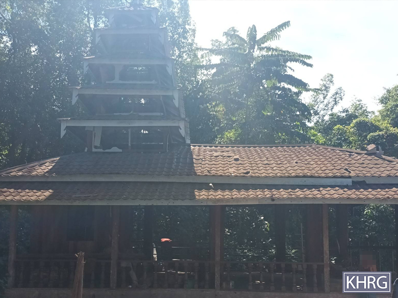 These photos were taken in November 2023 in A--- village, Maw village tract, Noh T’Kaw Township. On October 4th 2023, the SAC conducted air strikes into A--- village, damaging a church slightly. On November 2nd 2023, the SAC conducted another air strike into the same village, further damaging the same church. These photos show the damage to church from A--- village, and the remains of a 500-pound bomb from the SAC. [Photo: KHRG]