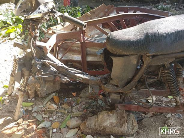 These photos were taken in October 2024 in A--- village, Seik Hpoo Taung village tract, Daw Hpah Hkoh Township, Taw Oo District. On October 7th 2024, SAC soldiers from IB #39 fired three rounds of mortar shells into A--- village. One of the mortars landed in Saw B---’s betel nut trees near his house and exploded, damaging his plantation, motorbike and house. The two photos on the top row show the damage to Saw B---’s house. The photo on the bottom left shows his destroyed motorbike. The photo on the bottom right shows the remnants of a mortar fin that landed on the betel nut trees. [Photos: KHRG]