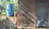 These photos were taken in December 2024 in I--- village, P’Saw Loh village tract, Daw Hpah Hkoh Township, Taw Oo District. On December 12th 2024, SAC soldiers from Shel Chauk Maing (Yay Pu San) village conducted shelling into I--- village, destroying the houses and property of three villagers. The two photos on the top row show the house of a villager named U J---, which was destroyed by the mortar explosion. The photo on the bottom left shows U J---’s electric motor for a water pump, which was destroyed by the explosion. [Photos: KHRG]