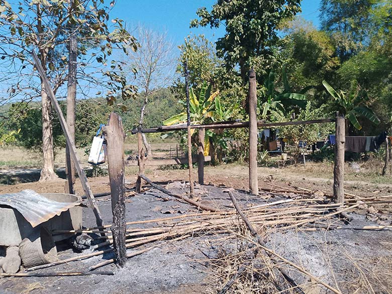 KHRG received these photos from a local villager from Way Htoo village tract, Daw Hpah Hkoh Township, Taw Oo District, in January 2025. The photos show some villagers’ houses in C--- village, Way Htoo village tract, burned by SAC soldiers on January 4th and 5th 2025, after a skirmish with PDF troops on the previous day. The SAC burned more than 30 houses in C--- village. [Photos: A local villager]