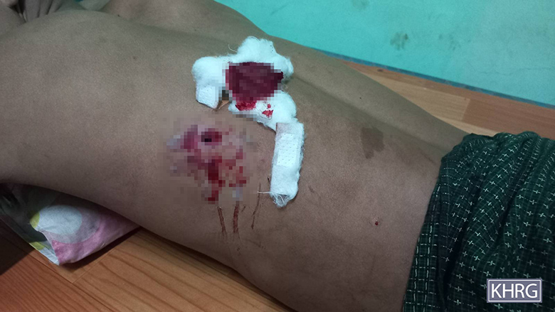These two photos were taken in January 2024, in a clinic in Aa--- village, Hk’Rweh village tract, Kyeh Htoh Township, Doo Tha Htoo District. On January 16th 2024, at 6:30 pm, SAC Artillery Unit #310 fired three 60 mm mortar shells into Aa--- village, Hk’Rweh village tract, and one of the mortar shells injured two teenage boys. The photo on the left shows Maung C--- (19 years old), who was injured on his back. The photo on the right shows Maung B--- (17 years old), who was injured on his left thigh. [Photos: KHRG]