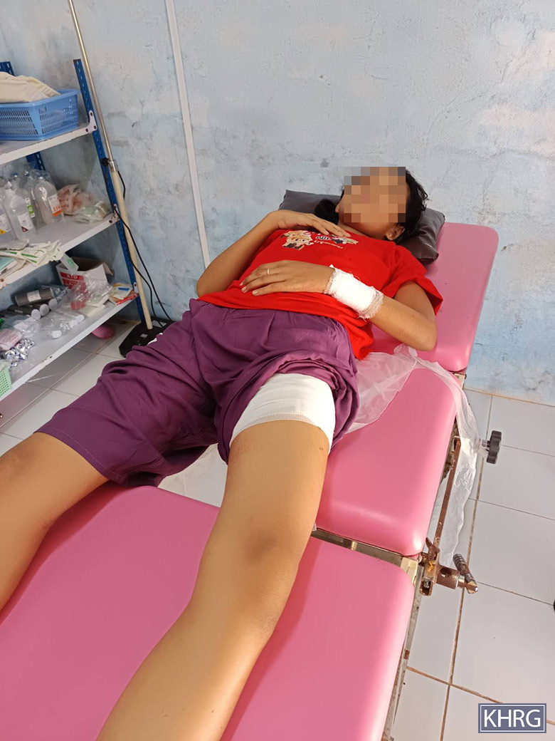 This photo was taken in November 2024, in Ad--- clinic, Noh Hkwee village tract, Ta Kreh Township, Hpa-an District. On November 28th 2024, SAC Infantry Battalion #97 conducted shelling (81 mm rounds) into Ab--- village, Yaw Kuh village tract, T’Nay Hsah Township, Hpa-an District. The shelling injured a 12-year-old girl, named Naw B---, on her left thigh, right calf, and arm. This photo shows Naw B--- receiving treatment in Ad--- clinic. [Photos: KHRG]