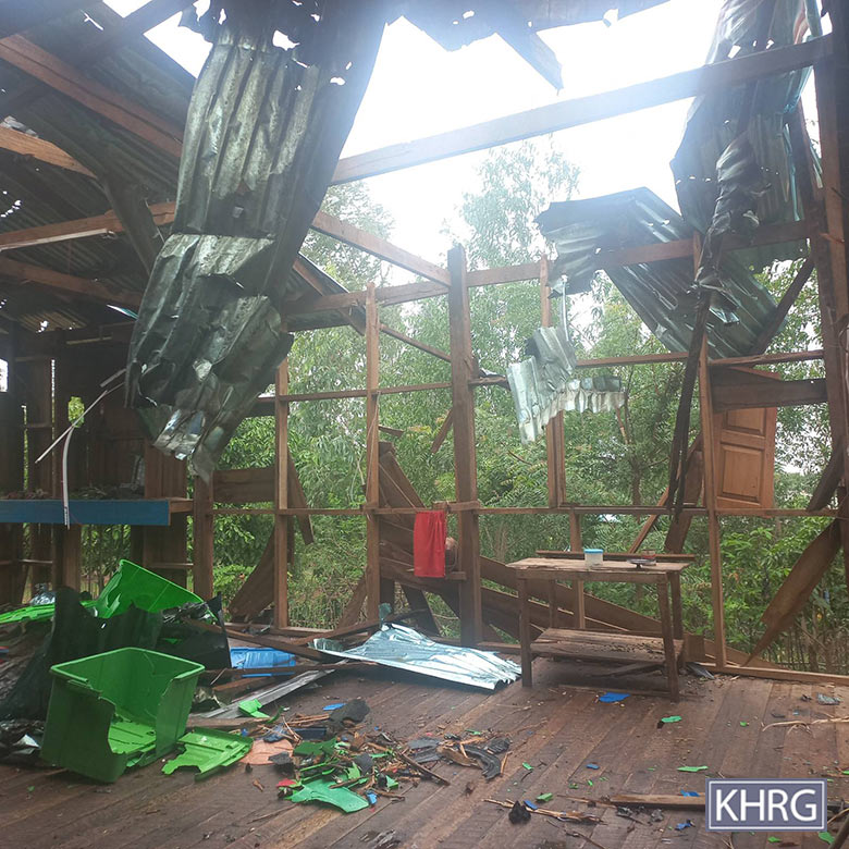 These photos were taken in June 2024, in Aa--- village, Hk’Rweh village tract, Kyeh Htoh Township, Doo Tha Htoo District. On June 12th 2024, at around 10 am, SAC Artillery Unit #310, under LID #44, based at Thein Za Yat Town, fired around 22 rounds of mortar (120 mm) into See Pyaw village tract, Pyin K’Don Kone village tract, and Hk’Rweh village tract, in Kyeh Htoh Township. One of the mortar shells landed on Ko I---’s and Ma J---’s house and destroyed it. These photos show the damage sustained to their house. [Photos: KHRG]