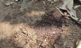 These photos were taken in November 2024 in a betel nut plantation near A--- village, Kaw Thay Der village tract, Htaw Ta Htoo Township, Taw Oo District. The left photo shows the rubber shoe that Saw C--- was wearing while working in the betel plantation. He was hit by the shrapnel of the mortar shell fired by the SAC on November 21st 2024. The explosion severed his leg and also caused a neck wound, leading to significant blood loss and ultimately causing his death. The right photo shows some blood of Saw C--- on the ground of the betel nut plantation. [Photos: KHRG]