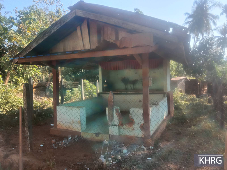 These photos were taken in January 2025, at Am--- village, Ah Su Chaung village tract, Bilin Township. On January 17th 2025, the SAC based at the Meh Pree army camp fired a 120 mm shell at around 7:31 pm. The shell landed in front of a monastery, Am--- village, causing damage to buildings on the monastery grounds and a nearby house. The photo on the top left shows the shell crater in front of the monastery gate. The photo on the bottom left shows a well building which was damaged by the shell, and the top right photo shows the spirit house which was damaged by the shell. [Photos: KHRG]