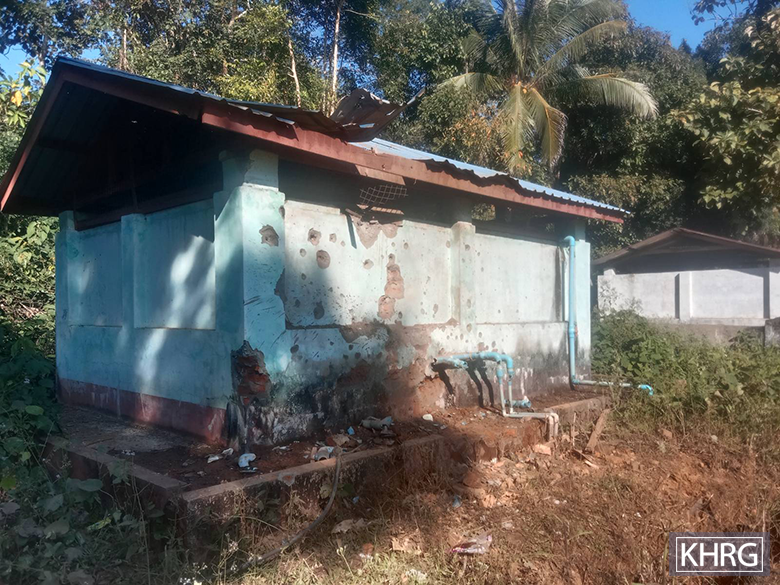 These photos were taken in February 2025 at Am--- village, Ah Su Chaung village tract, Bilin Township, Doo Tha Htoo District. The photos show damage caused after an SAC fighter jet that dropped a bomb near the entrance of a school in Am--- village on February 7th 2025. The bomb destroyed the teachers’ boarding house and damaged the school building. [Photos: KHRG]