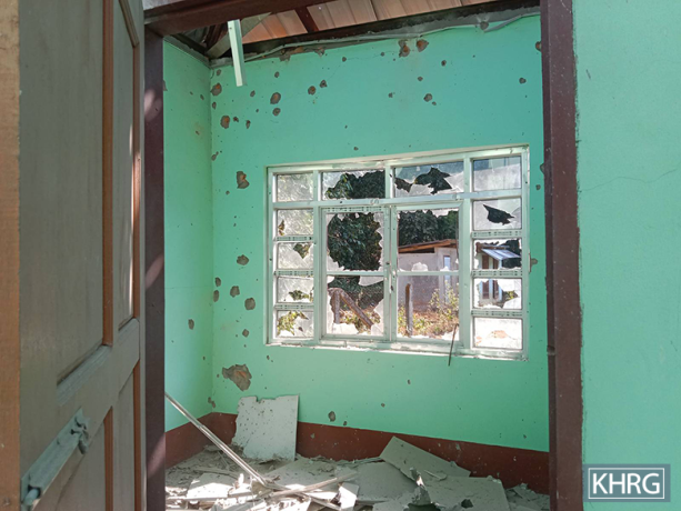 These photos were taken in January 2025 at Bf--- village, Min Saw village tract, Bilin Township, Doo Tha Htoo District. The photos show the damage to a middle school caused by an SAC drone strike on January 16th 2025 at Bf--- village. The photo on the left displays the damaged metal roof and ceiling of the school. The photo on the right displays the shattered glass windows and damage to the ceiling of the school. [Photo: KHRG]